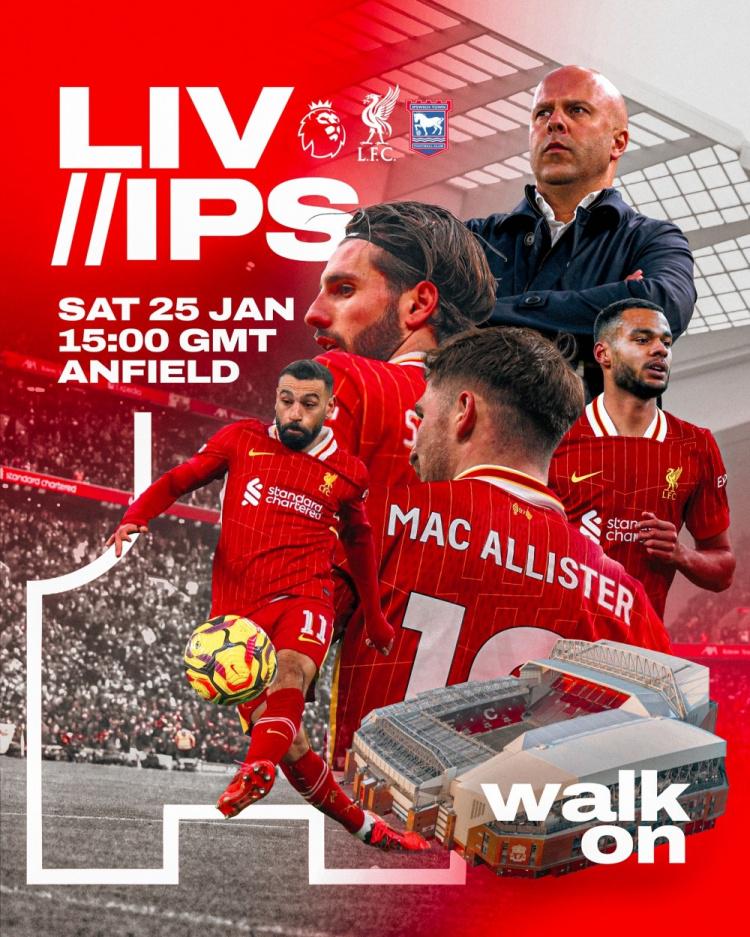 利物浦晒对阵伊镇海报:斯洛特、萨拉赫、加克波、麦卡利斯特出镜